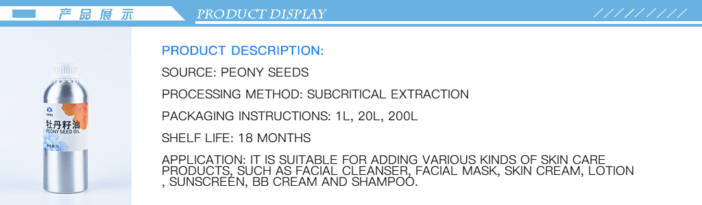 Peony seed oil rich unsaturated fatty acid content, composition is balanced, and contain the VA, VE, Nick acid and carotene composition, has excellent nutrition care effect to the skin, can obviously improve the function of the skin epidermis cell cycle, improve skin blood capillary microcirculation, inhibition of lipid peroxidation, improve metabolism, delay skin aging, anti-wrinkle, moisturizing and whitening effect.