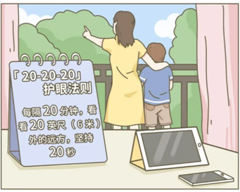 視屏?xí)r遵循“20—20—20”法則,即觀看電子屏幕20分鐘后,要抬頭遠(yuǎn)眺20英尺(6米)外20秒鐘以上。