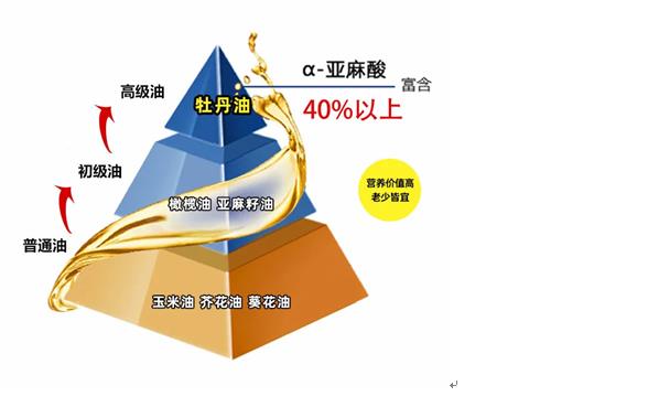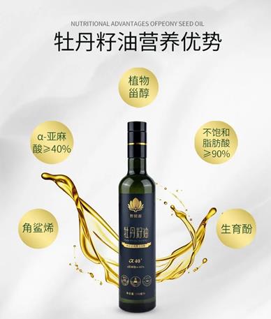 牡丹籽油不飽和脂肪酸達到90%以上,其中,α-亞麻酸高達42%,居各類油脂之首。