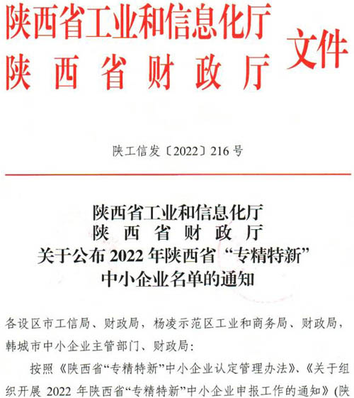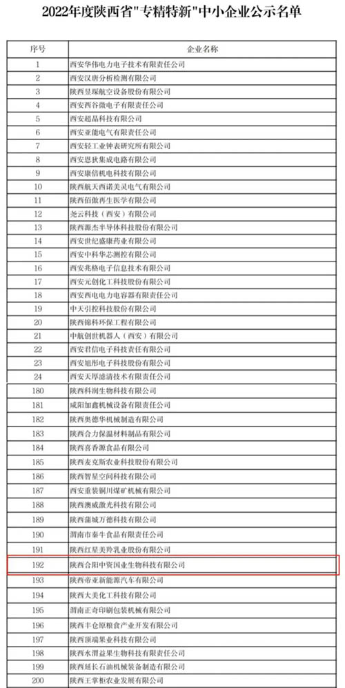 日前,陜西省工信廳、財政廳公布2022年陜西省“專精特新”中小企業(yè)名單,陜西合陽中資國業(yè)生物科技有限公司榮膺榜單!