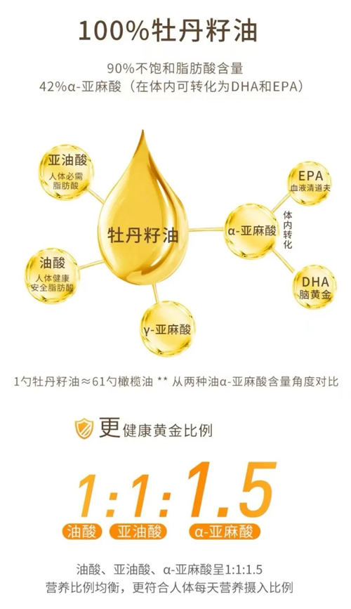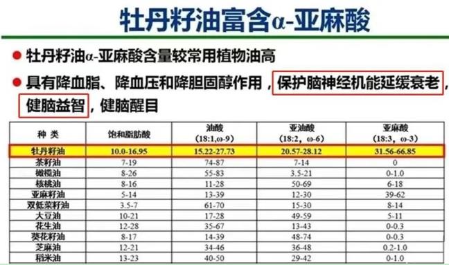 牡丹籽油的α-亞麻酸(屬Ω-3系列)是人體必須脂肪酸,是DHA(腦黃金)、EPA(血管清道夫)的母體,是(嬰幼兒、青少年)腦神經(jīng)、視神經(jīng)構(gòu)成和發(fā)育的主體成分,被世界衛(wèi)生組織(WHO)和聯(lián)合國(guó)糧食組織譽(yù)為“血液營(yíng)養(yǎng)素,植物腦黃金”。
