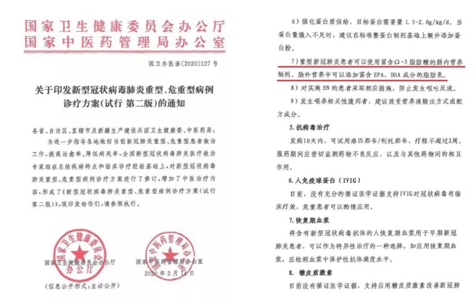 原文指出:“重型新冠肺炎患者可以使用富含Ω-3(Omega-3)脂肪酸的腸內營養(yǎng)制劑。