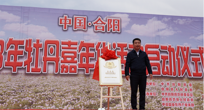 合陽縣委副書記段武學(xué)為中資國業(yè)合陽萬畝牡丹莊園“國家AAA級旅游景區(qū)”揭牌。