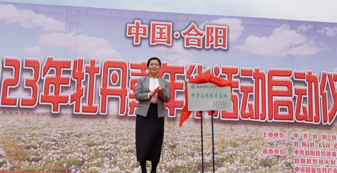 合陽縣委常委、副縣長王改為中資國業(yè)萬畝牡丹莊園“省級中小學(xué)生實踐教育基地”揭牌。