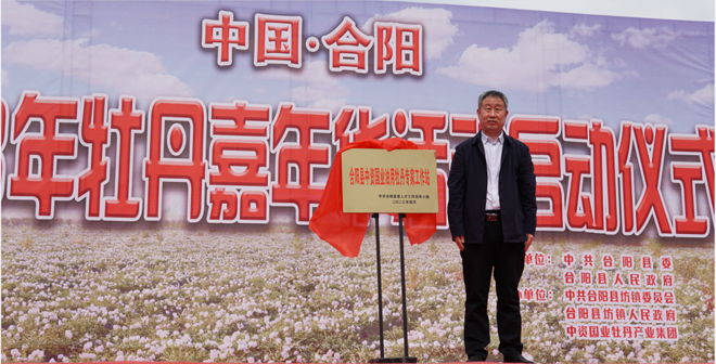合陽縣委常委、組織部部長胡兆林為中資國業(yè)萬畝牡丹莊園“縣級專家工作站”揭牌。
