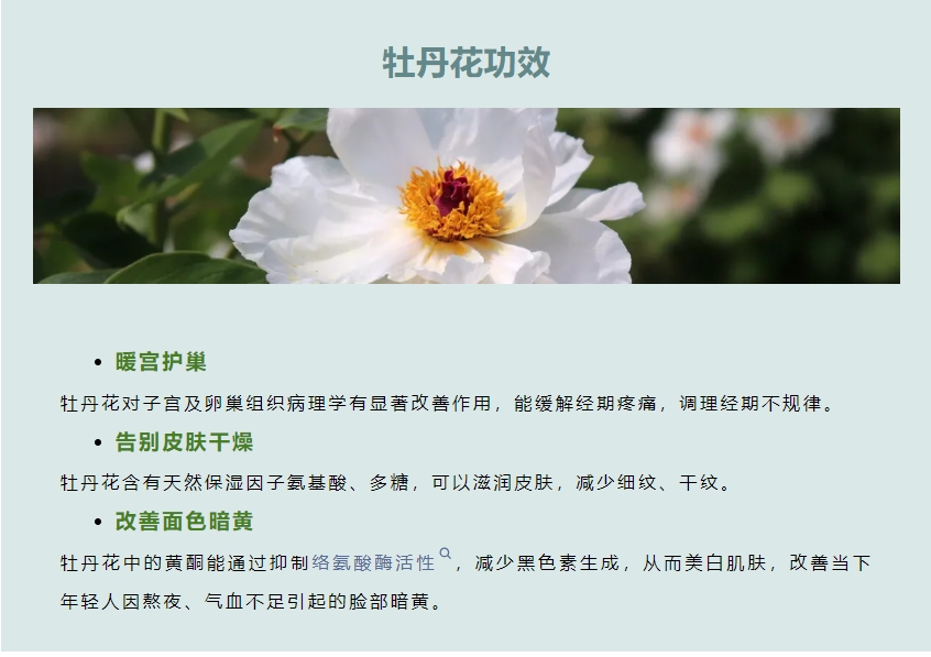 近代對(duì)牡丹花的研究更為深入和廣泛,發(fā)現(xiàn)了牡丹花對(duì)女性有諸多益處,其中開花初期的牡丹花效果更好。