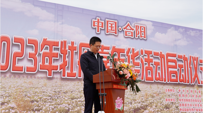 合陽縣委副書記段武學(xué)為中資國業(yè)合陽萬畝牡丹莊園“國家AAA級旅游景區(qū)”揭牌。